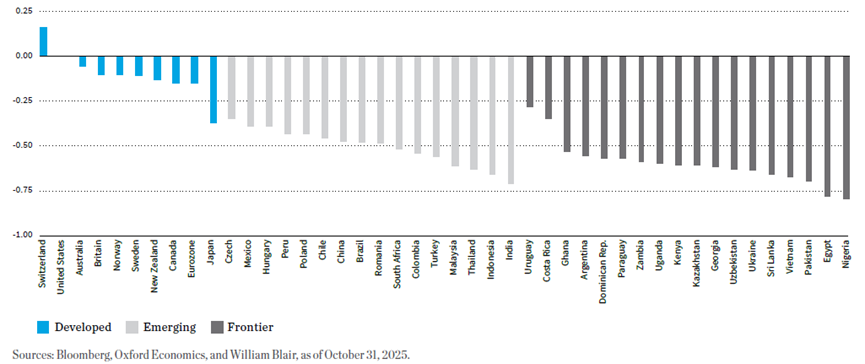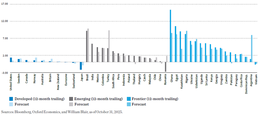 新興市場與前沿市場的過往及預測實質殖利率,普遍顯著高於已開發市場(後者的實質殖利率仍接近零或為負值)。這種差異凸顯了尋求正向實質回報的投資者所具備的潛在優勢,因為相對於已開發市場,新興市場與前沿經濟體可能提供更具吸引力的收益機會。
