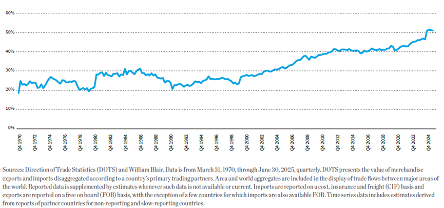 新興市場內部貿易目前佔新興市場總貿易額的 50% 以上,遠高於 2000 年代初期的約 25%。這代表新興市場對已開發經濟體(特別是美國)的依賴顯著降低。